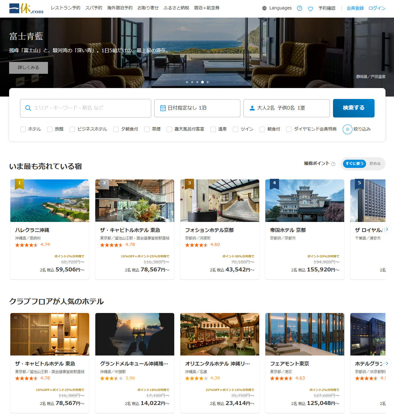 【PR】⼀休.com 詳細はこちらをクリック お得に宿泊予約ができるサイトのご紹介です。全国約9,700の高級ホテル・旅館、またワンランク上のビジネスホテルを 【タイムセール】や【限定プラン】など充実のプランでお得に予約できるサイトです。 各種セールをご活用いただくことで泊りたかったあの施設にお得にご宿泊できるそうです。ビジネスマンの方が空き時間にご利用しやすい【デイユース】プランも人気です。 出張や空き時間利用、リモートワークの訴求がおススメ♪ 予約が増えるのはやっぱり連休! GWや夏休み、お正月休みの大型連休はもちろん3連休や通常の週末ももちろん人気。 商材名 一休.com運営者 KS※当サイトはアフィリエイトプログラムを利用し宣伝目的で作成しております。